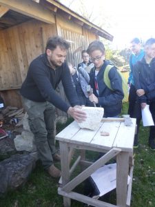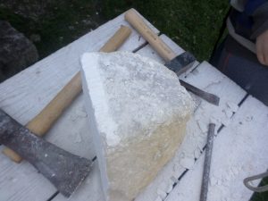L’archéologue avait prévu un atelier « taille de pierre ». Après une explication de la taille et des outils utilisés par les artisans du Moyen Age, les élèves se sont improvisés tailleurs de pierre.