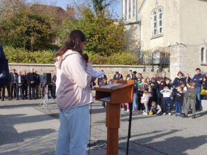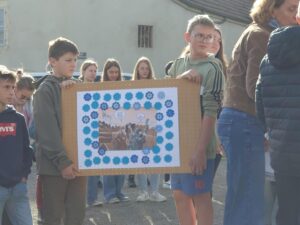 En effet, le bleuet de France célèbre son centenaire. Lors de l’appel aux morts, avec beaucoup de solennité, des élèves ont collé autant de bleuets que de noms inscrits sur le monument aux morts.
