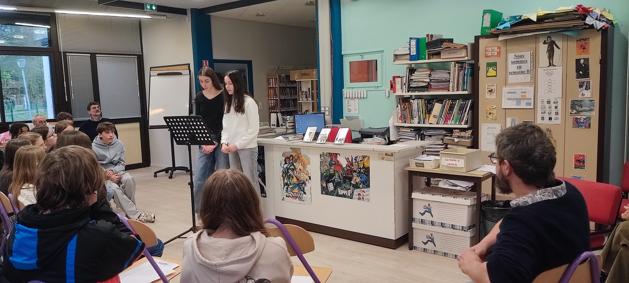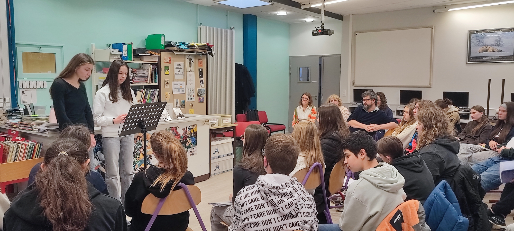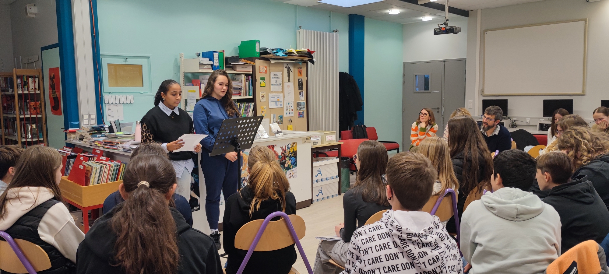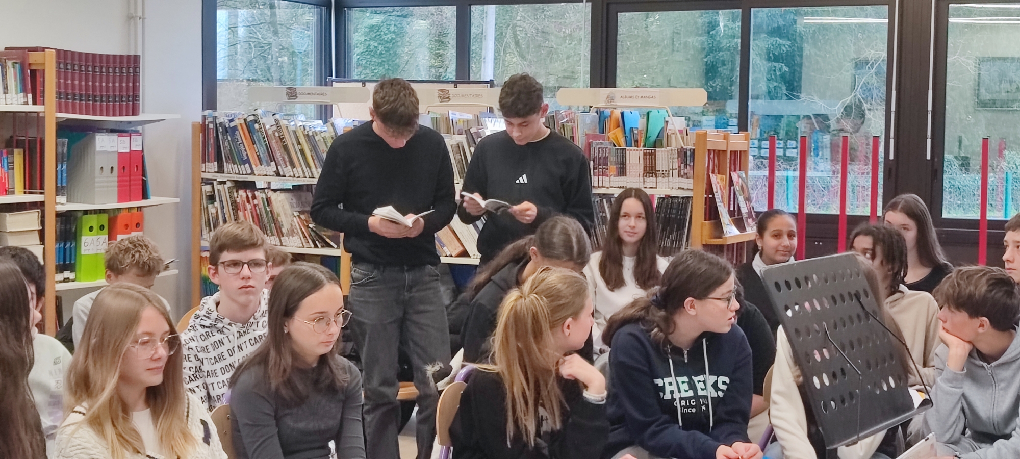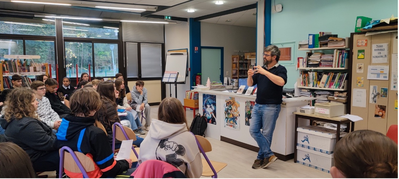 Accueillis au CDI du collège, l’atmosphère fut chaleureuse et les élèves ravis de bénéficier de l’apport de l’auteur sur une œuvre analysée en cours, ce qui est exceptionnel !
