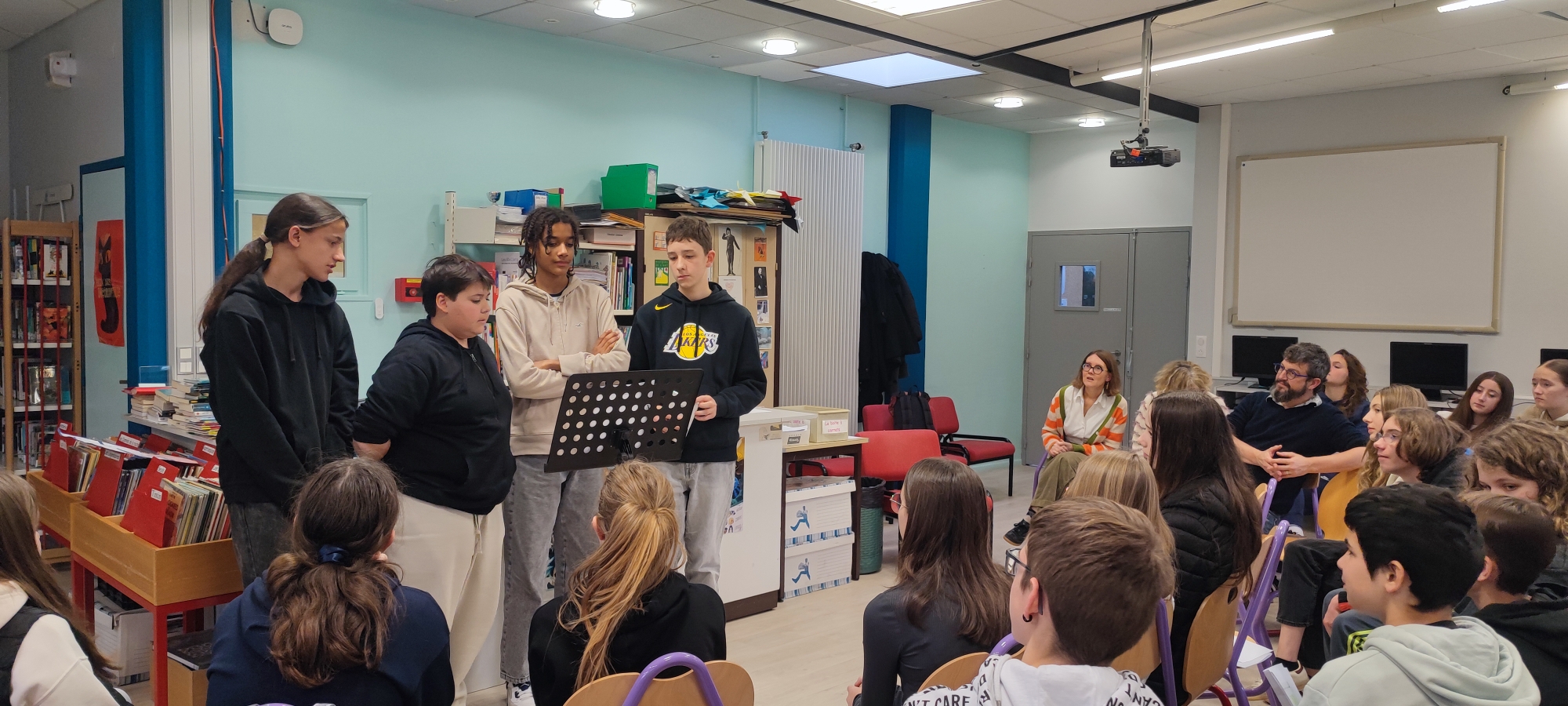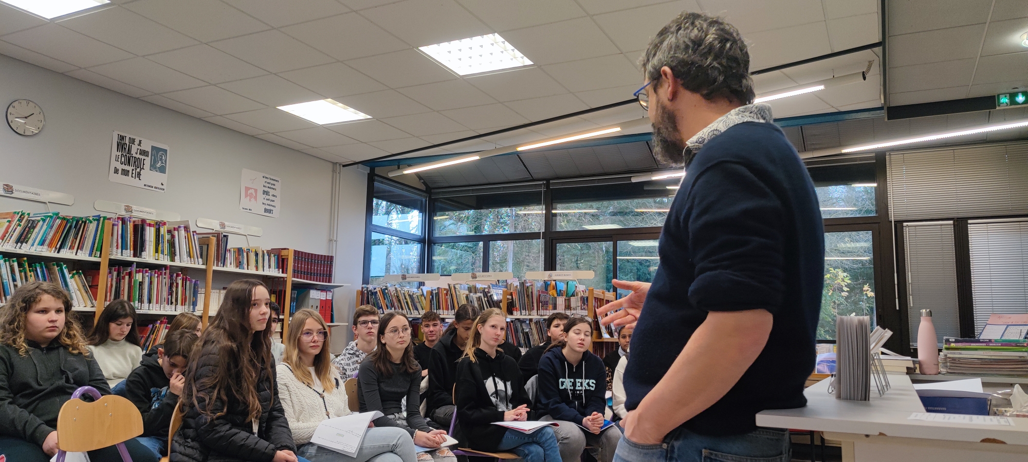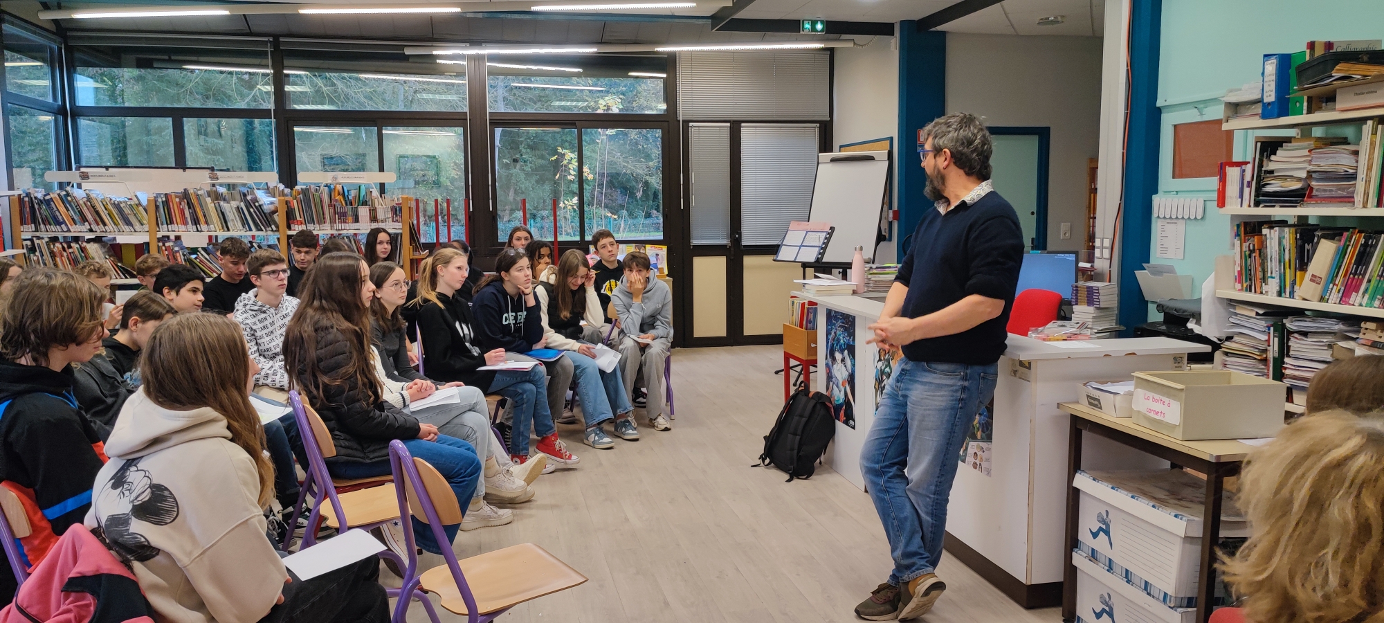 Jeudi 20 novembre 2025, dans le cadre du festival littéraire des Petites Fugues organisé par l’Agence Livre et Lecture Bourgogne-Franche-Comté, les élèves des deux classes de 3ème ont eu le plaisir d’accueillir M. Simon Grangeat, dramaturge contemporain.
